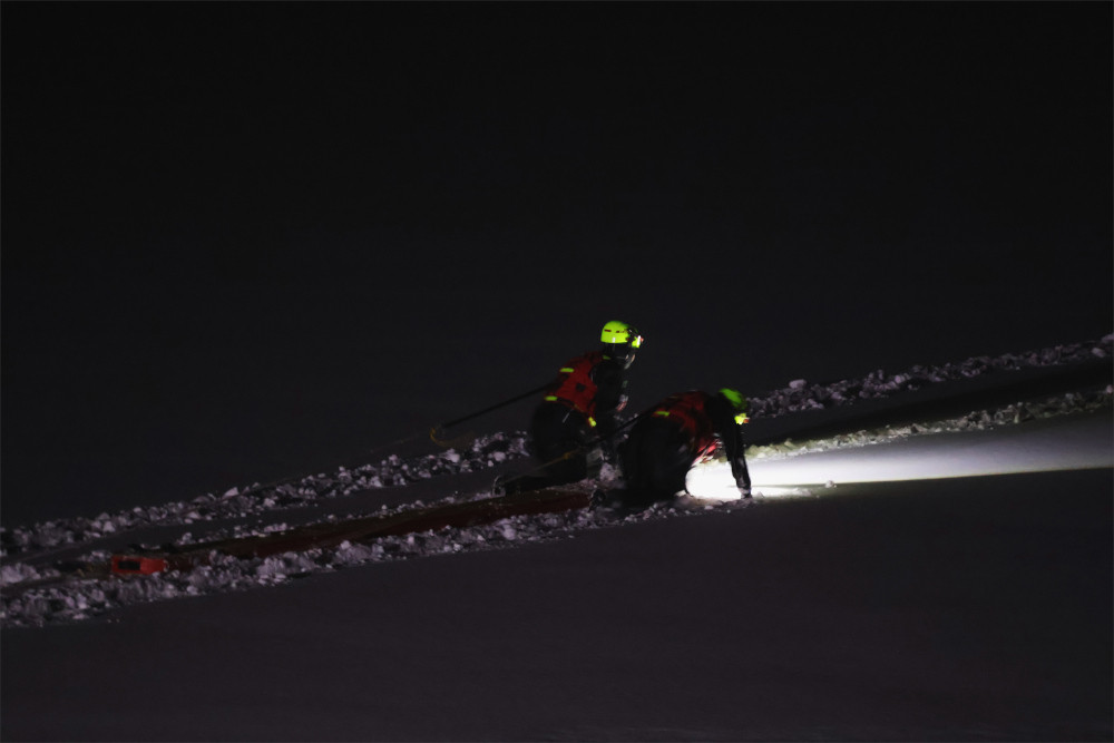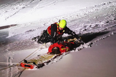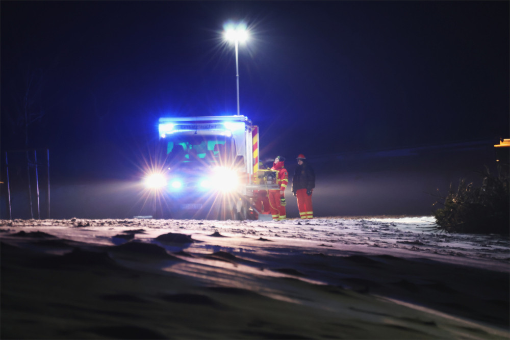 Beim Eintreffen bestätigte sich das gemeldete Einsatzbild (Übungsbild). Zwei Personen waren etwa 100 Meter vom Ufer entfernt in das Eis eines zugefrorenen Gewässers eingebrochen und mussten durch die Einsatzkräfte gerettet werden.
